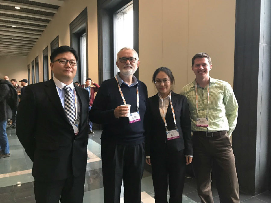 而我的口头报告排在了第二天早上,第一次在这么大型的会议上做英文报告,的确有些紧张。报告当天,我在佐治亚理工交流期间的导师及实验室的小伙伴们也一起来了,附下图一张。我的报告被安排在上午茶歇后第三场,第一场报告人是Ali Javey, 是UC Berkeley的研究半导体电子器件方向教授,全场爆满。Ali报告也特别的精彩,半个小时,激情澎湃。结束后,看到人们一哄而散,人气对比特别明显。当时小庆幸了一下并没有直接排在大牛后面。”