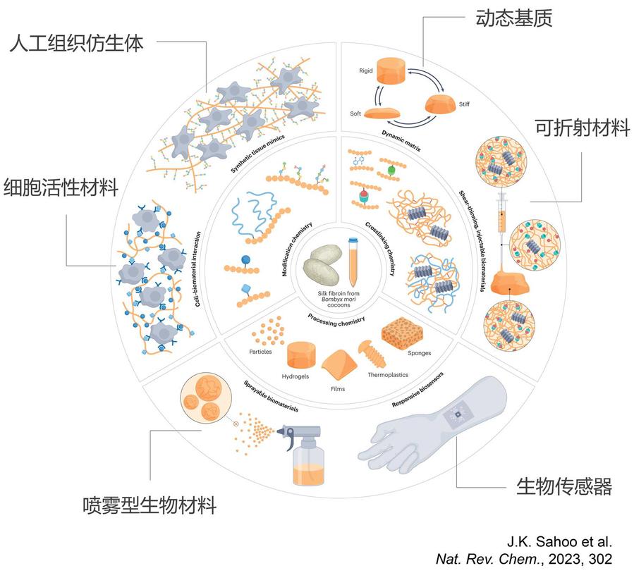 丝蛋白作为一种天然蛋白质材料,因其本征的生物相容性和几乎可忽略的免疫原性,广泛应用于生物医用材料领域。除传统组织工程外,丝蛋白材料还表现出在生物成像、药物递送、伤口敷料、抗菌材料、细胞活性调控界面、人体组织仿生态构建及生物传感器等多个方向的重要应用潜力。这种广泛的应用前景,一方面归因于丝蛋白作为生物大分子所固有的优异生物兼容性和低免疫应答;另一方面则源于其良好的可加工性和多尺度可调控的力学性能。然而,纯丝蛋白自身的功能相对单一,常需通过与活性因子、药物、抗菌剂或成像纳米材料等功能性组分复合,从而构建组成、结构、性能和功能多维度可调的复合材料体系,进一步拓展和优化丝蛋白材料在各类生物医学场景下的实际应用性能。