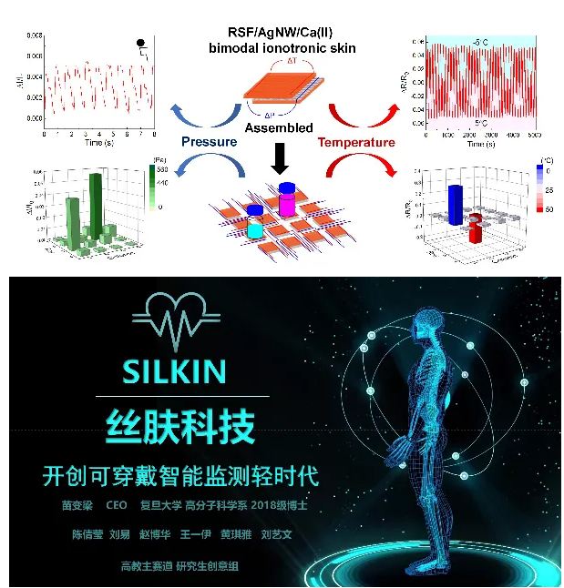 其中一个工作旨在设计了表面具有微结构的RSF/AgNW/Ca(II)水凝胶,并将其组装成具有双重响应性能的传感器,实现了对压力和温度的双响应,且具有低温可工作性,以期待其在可穿戴健康监测设备领域具有良好的应用前景,极具实际应用价值。