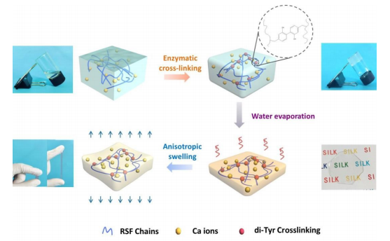 Soft electronic devices have rapidly developed and gained increasing attention in the past few years. Herein, a conductive silk-based hydrogel is prepared by crosslinking regenerated silk fibroin (RSF) aqueous solution with horseradish peroxidase (HRP) and adding a large amount of CaCl2 to hold water. The obtained RSF/CaCl2/HRP hydrogel is highly stretchable (breaking strain of 600% with an elastic modulus of 20 kPa) and transparent because the introduction of Ca(II) ions suppresses the formation of silk fibroin β-sheet crystals in the hydrogel. In addition, the presence of CaCl2 endows the RSF/CaCl2/HRP hydrogel with anti-drying and anti-freezing properties. The hydrogel remains soft (breaking strain of approximately 580%) and conductive (conductivity of 0.17 S/m) at -30°C. Moreover, the RSF/CaCl2/HRP hydrogel possesses good self-adhesive properties on different substrates, including wood, glass, metal, and plastic. Peeling strength of the hydrogel from hog skin is better than that of the commercial bandage tape. More importantly, the RSF/CaCl2/HRP hydrogel possesses both strain and temperature sensing ability. Hence, it can be assembled into a strain/temperature dual sensor. Such a highly stretchable, transparent, and self-adhesive strain/temperature dual sensor is a good candidate for an ionotronic skin. When tested as an ionotronic skin, the results show that this RSF-based hydrogel monitors body movements very well and can even recognize voice information from throat movements. Therefore, the proposed novel silk-based conductive hydrogel has promising potential in applications of soft electronic devices.