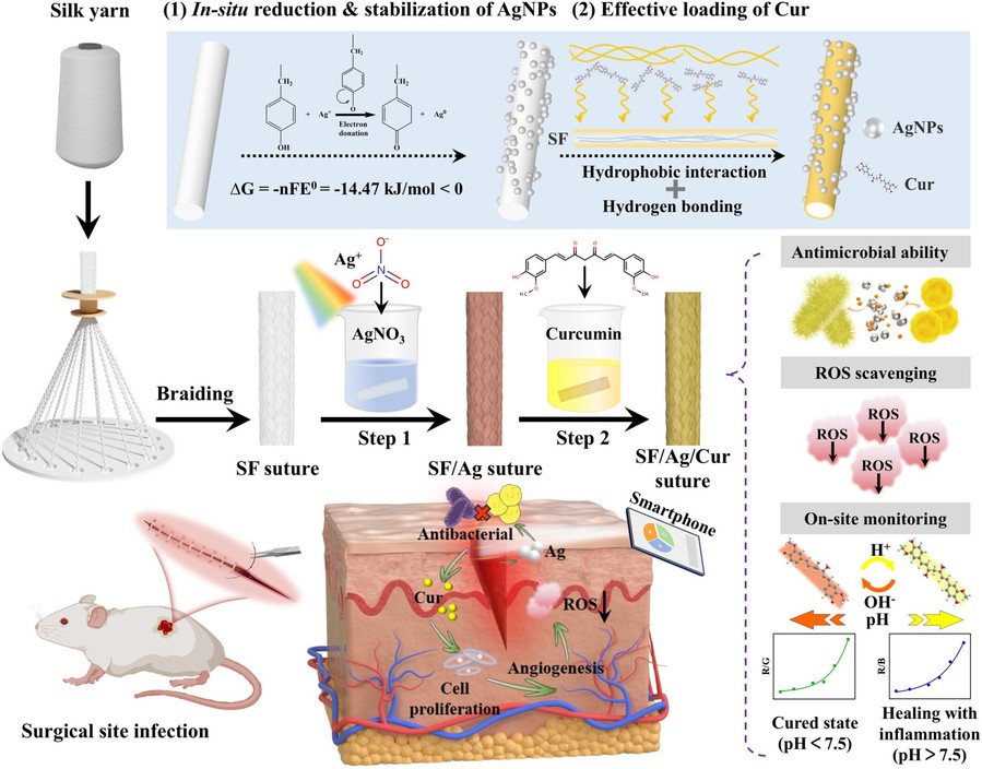 Developing surgical sutures with adjustable bioactivities is essential for diverse surgical interventions. However, adversely affecting their mechanical integrity, biocompatibility, and bioactivity poses a significant challenge. Herein, we present a silk‐based bioactive suture that incorporates silver nanoparticles (AgNPs) and curcumin (Cur) via a dual in situ integration strategy. This innovative approach leverages the unique reactive groups and molecular interactions inherent in silk to facilitate the in situ reduction of AgNPs and the conformal loading of Cur. Extensive in vitro and in vivo evaluations confirm the suture's multifunctionality. This suture excels in real‐time wound monitoring due to its sensitive colorimetric pH response. It is biocompatible and offers strong antibacterial and anti‐inflammatory benefits, essential for infection prevention and inflammation control postsurgery. Moreover, it actively aids wound healing by promoting angiogenesis and collagen deposition, vital for effective tissue repair. This approach provides a promising foundation for creating advanced smart sutures with on‐demand bioactivities and on‐site monitoring capabilities.