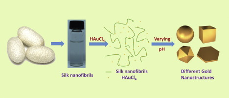 Metal nanostructures that have unique size- and shape-dependent electronic, optical and chemical properties gain more and more attention in modern science and technology. In this article, we show the possibility that we are able to obtain different gold nanostructures simply with the help of silk nanofibrils. We demonstrate that only by varying the pH of the reaction solution, we get gold nanoparticles, nano-icosahedrons, nanocubes, and even microplates. Particularly, we develop a practical method for the preparation of gold microplates in acid condition in the presence of silk nanofibrils, which is impossible by using other forms of silk protein. We attribute the role of silk nanofibrils in the formation of gold nanostructure to their reduction ability from several specific amino acid residues, and the suitable structural anisotropic features to sustain the crystal growth after the reduction process. Although the main purpose of this article is to demonstrate that silk nanofibrils are able to mediate the formation of different gold nanostructure, we show the potential applications of these resulting gold nanostructures, such as surface-enhanced Raman scattering (SERS) and photothermal transformation effect, as same as those produced by other methods. In conclusion, we present in this communication a facile and green synthesis route to prepare various gold nanostructures with silk nanofibrils by simply varying pH in the reaction system, which has remarkable advantages in future biomedical applications.