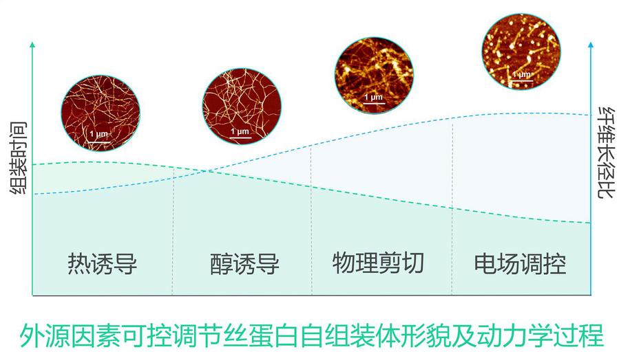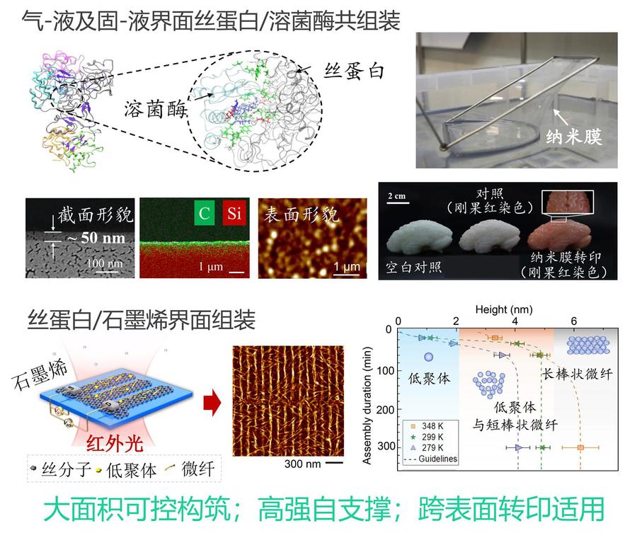 The alternating arrangement of hydrophilic-hydrophobic domains in silk fibroin endows it with an inherent self-assembly tendency, with the assembly process regulated by nucleation-growth kinetics. Various exogenous factors can precisely control the morphology of assemblies (such as microfibrils and microspheres) and kinetic pathways. Its β-sheet structure provides biomimetic mineralization templates for inorganic minerals, inducing the formation of metastable crystal phases, thereby expanding preparation strategies for biomedical materials (such as bone repair) and new energy materials (such as electrodes). Furthermore, silk fibroin with lysozyme and other proteins can form dense, self-supporting ultrathin films at gas-liquid/solid-liquid interfaces with transferable properties, providing novel structural building blocks for the development of micro-nano functional devices.